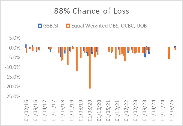 But here’s a fun fact, from 2016 to 2025, there were only 5 months in which the STI ETF delivered positive returns when an equal weighted composite of the three banks posted losses. In other words, a decade of history suggests that 88% of the times your STI ETF will lose money when your DBS-OCBC-UOB equal weighted portfolio tanks! This is one set of eights of that does not sound very propitious.