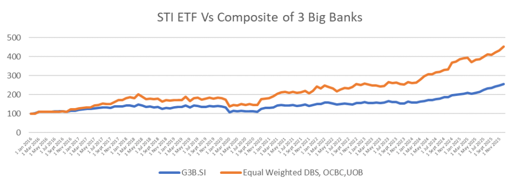 Over the 10 years to December 2025, the STI delivered annualised returns of approximately 9.9%. Over the same period, DBS returned 22.1% per year, OCBC 14.9% and UOB 12.0%. An equal-weighted portfolio of the three banks– without any index constituents beyond them– generated annualised returns of 16.5%.